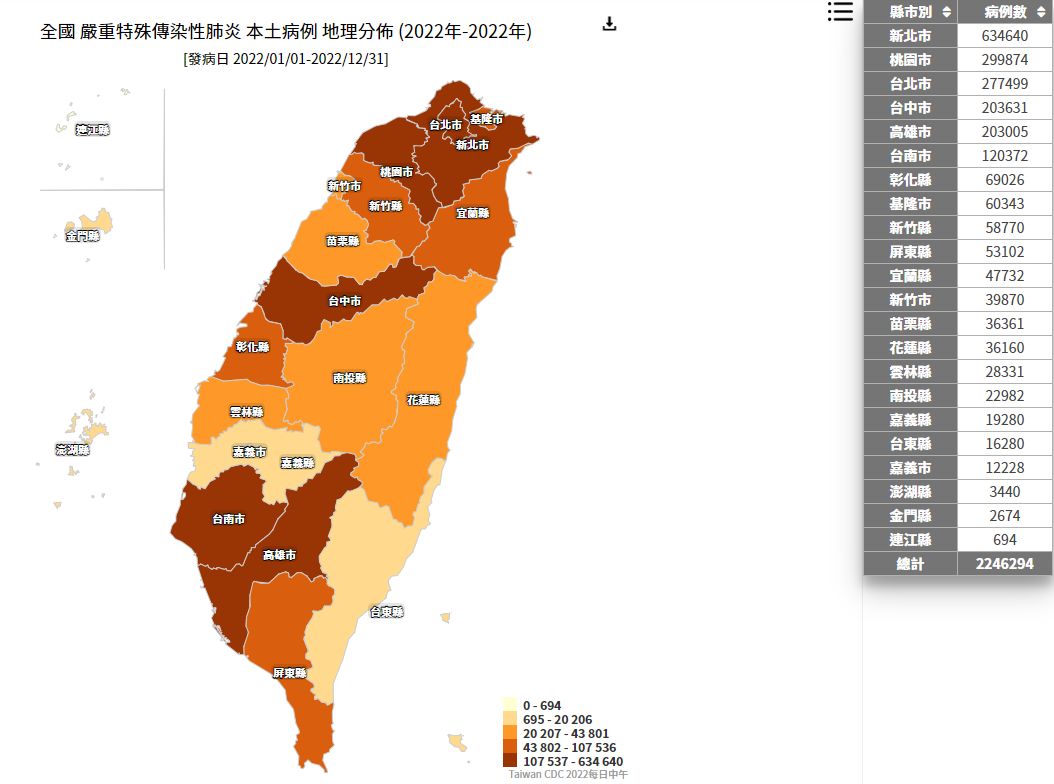 「本土病例地理分布」可見,今年1月1日統計至今,全台已有224萬6294人確診,其中新北63萬4640例最多,接著是桃園29萬9874例、北市27萬7499例,第四第五名分別為台中20萬3631例、高雄市20萬3005例,該兩都首度突破20萬。
