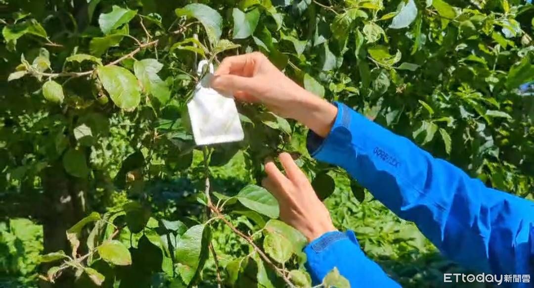 ▲福壽山農場員工將草蛉茶包放置在蘋果樹上。(圖/記者哈勇價 奧翻攝)
