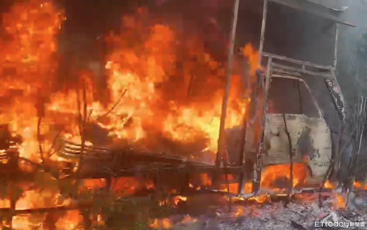 ▲台61線雲林口湖段下方崙東村產業道路今日下午突然發生廢棄貨車自燃。(圖/記者蔡佩旻翻攝)