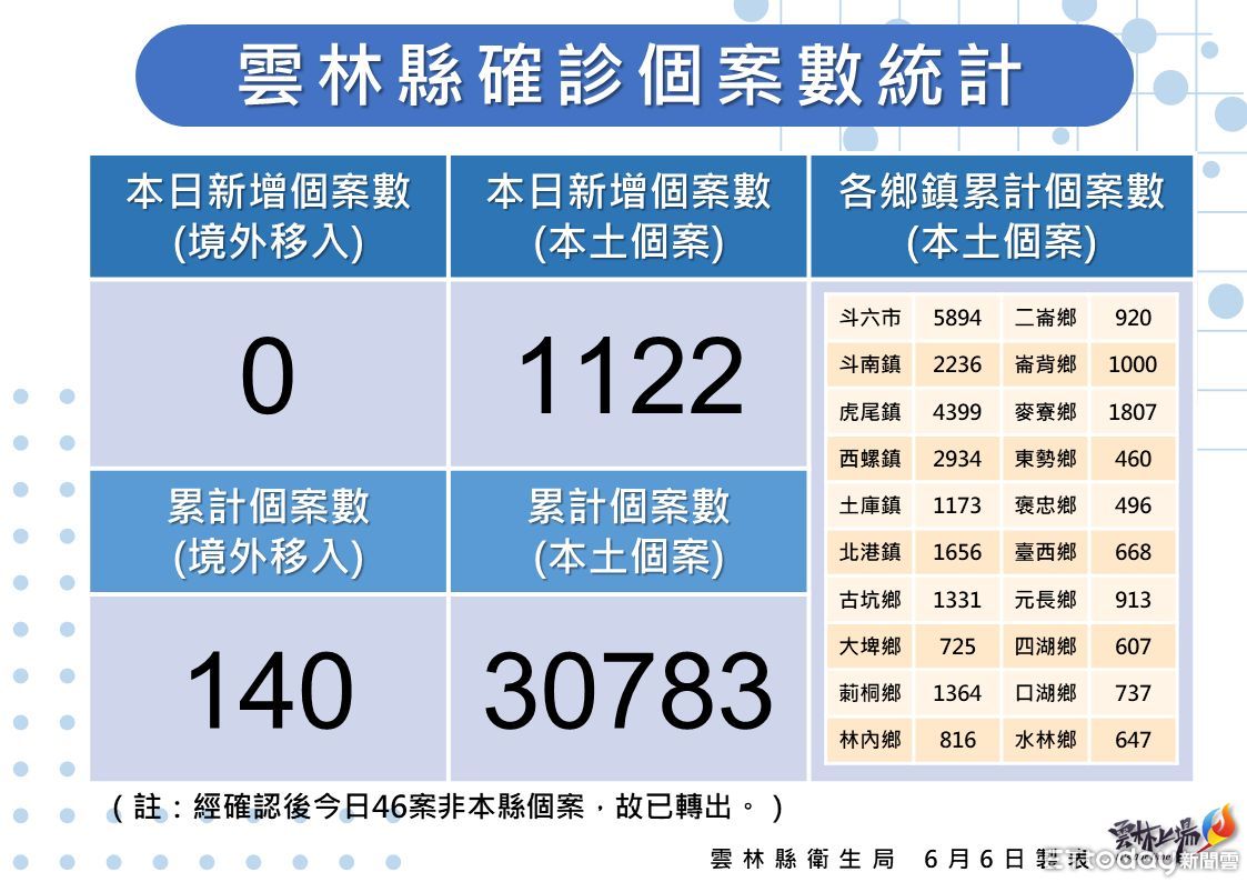 雲林今(6)日新增1122例本土確診個案,分別為斗六212例,虎尾174例,西螺126例,斗南90例,古坑61例,麥寮、崙背51例,土庫、北港48例,莿桐46例,二崙39例,林內34例,大埤、水林19例,口湖、四湖16例,東勢、元長15例,褒忠14例,台西30例個案分佈20鄉鎮。