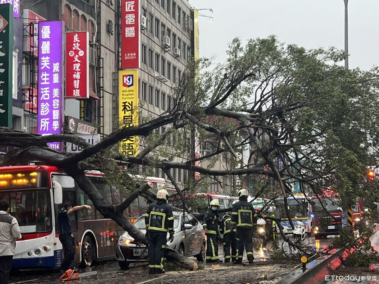 目擊民眾表示,當時路樹慢慢搖晃,公車正巧進站,乘客也都下車完畢,但就在準備起步時,路樹整個連根倒下壓在公車車頂。不過,好險公車有擋住,否則後方機車向前通行,後果恐不堪設想。