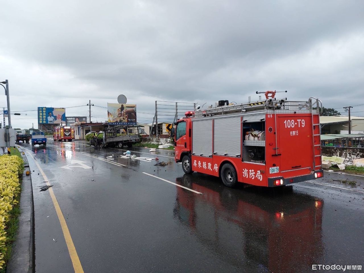 枋寮警分局於6月7日早上5時許接獲報案,於枋寮鄉台1線南下441.5公里處發生1部自用小貨車自撞交通事故,警、消趕往救援, 到場發現韓姓駕駛人(57歲)駕駛自用小貨車沿台1線(北往南)方向直行,途經案發地點,疑因爆胎且天雨路滑,撞擊路旁護欄導致該車起火燃燒,車上載送貨物散落一地。