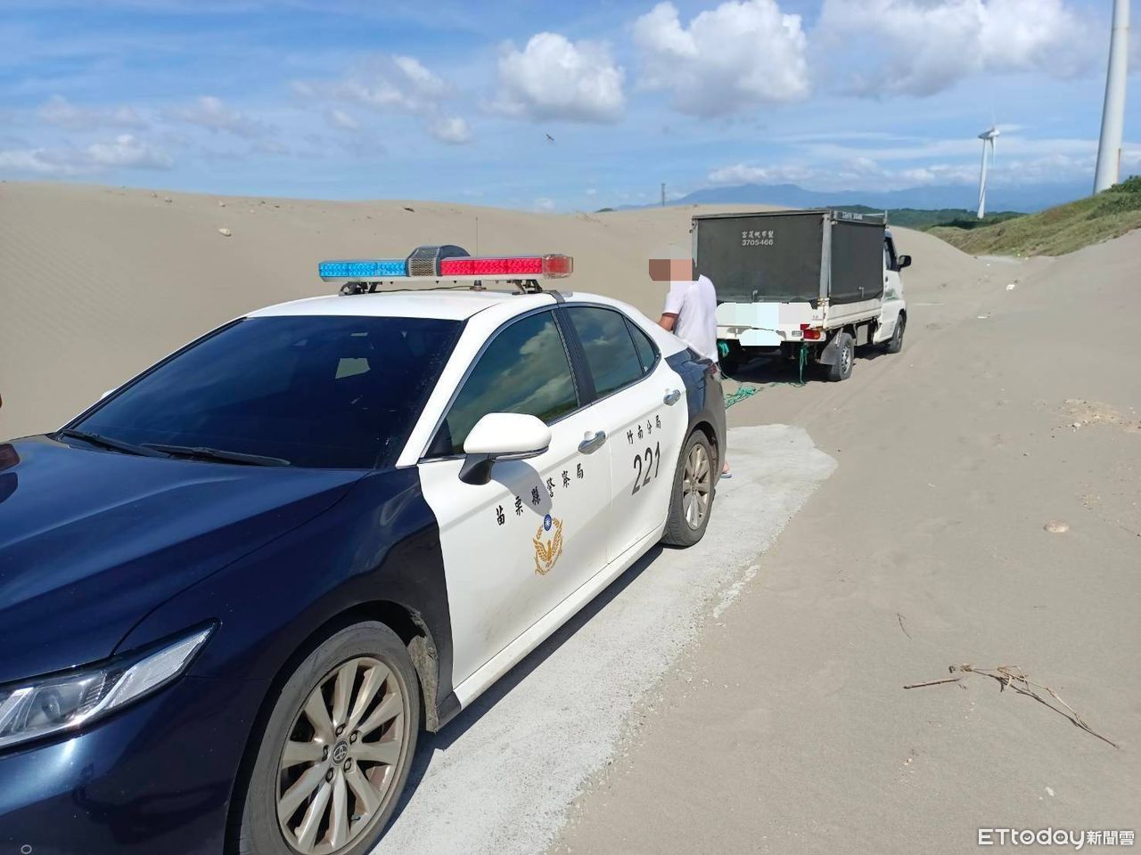 竹南警察分局南勢派出所副所長李增灝5日14時15分許接獲民眾報案稱,其所駕駛的自小貨車受困在後龍鎮山邊媽祖宮旁海邊小路沙堆中動彈不得,隨即趕赴現場處理。