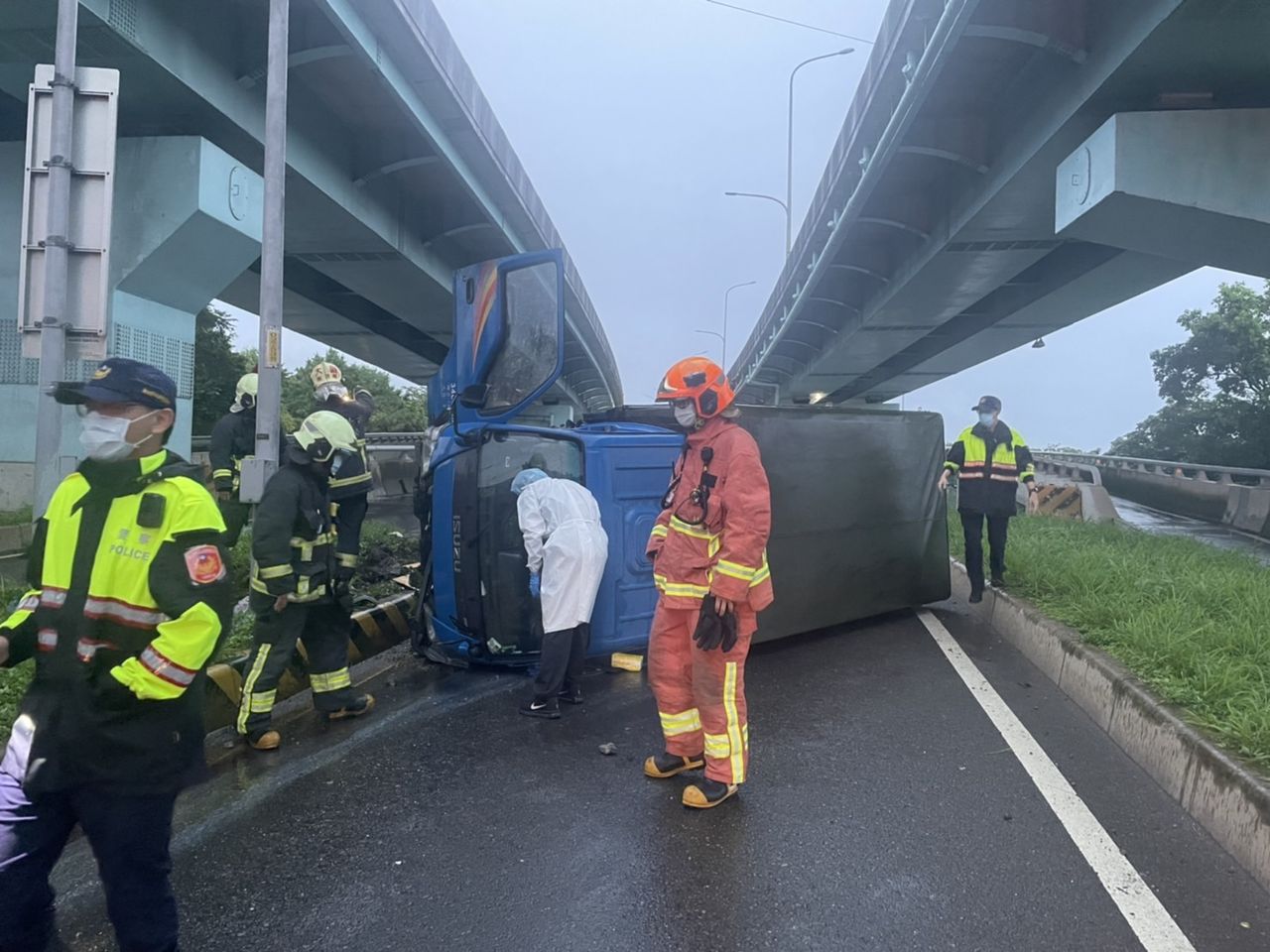 據了解,36歲的阮男事發時開著藍色小貨車,沿台65快速道路往土城方向行駛,在下板城路出口匝道時,因天雨路面積水,打滑自撞分隔島,整輛小貨車側翻路中,還波及對向的機車專用道。阮男事發後右腳擦傷,一度受困車上。