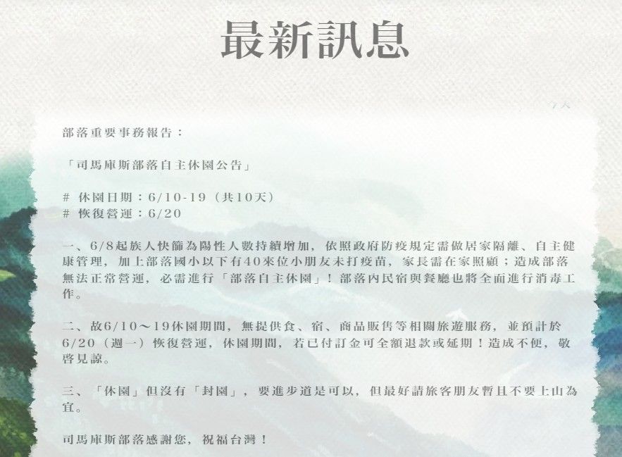 司馬庫斯官網下午公告「部落自主休園公告」,至6/10-19(共10天)。官網表示,8日起族人快篩為陽性人數持續增加,依照政府防疫規定需做居家隔離、自主健康管理,加上部落國小以下有40來位小朋友未打疫苗,家長需在家顧;造成部落無法正常營運,必需進行「部落自主休園」! 部落內民宿與餐廳也將全面進行消毒工作。故6/10~19休園期間,無提供食、宿、商品販售等相關旅遊服務,預計6/20(週一)恢復營運,休園期間,若已付訂金可全額退款或延期!