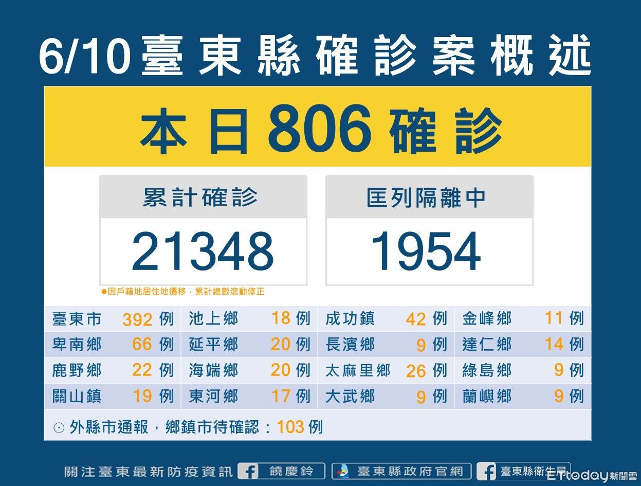 台東縣10日新增806名確診者,703名民眾戶籍或居住地分在台東、103名為外縣市醫院通報。目前台東縣累計確診個案21348人、居隔者1954人。目前台東針對Covid-19確診者分流收治情況,截至6/9下午4點為止,住院收治人數為63人、加強版集中檢疫所為42人、居家照護現管人數有3589人。