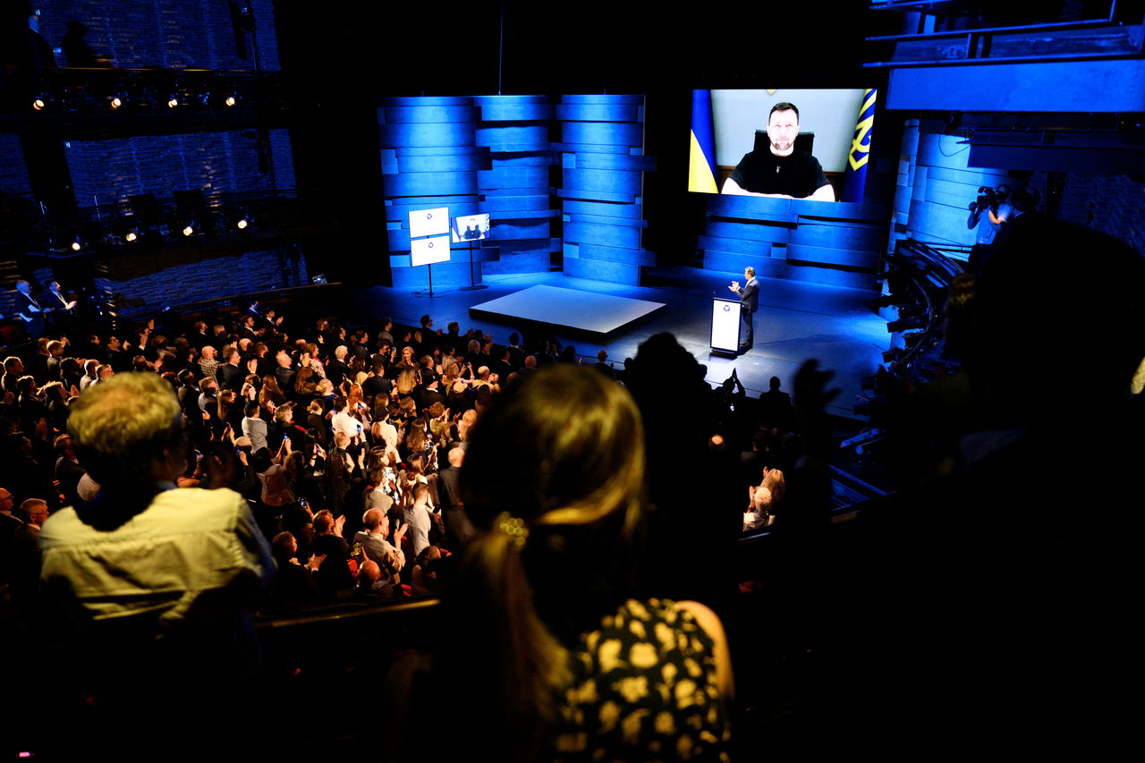 ▲烏克蘭總統澤倫斯基9日在哥本哈根民主峰會視訊演說,台下聽眾起身鼓掌。(圖/路透)