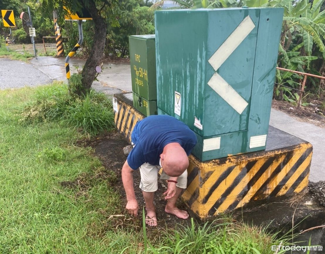 ▲在變電箱後面尋獲正低頭拔草把玩的陳姓老翁。(圖/記者楊漢聲翻攝)