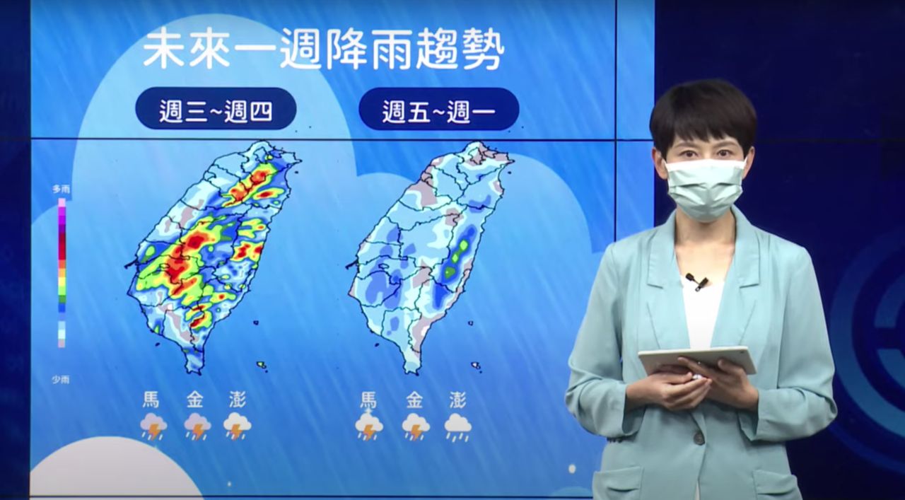 週三、四北方鋒面逐漸往台灣靠近,白天高溫略降3到4度,不過仍有30度以上,西半部不定時有局部短暫陣雨或雷雨,午後雷陣雨發展旺盛,靠近山區有局部大雨。