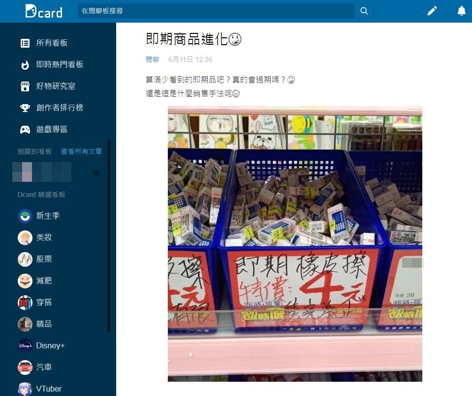 這位女網友在Dcard板上貼文,「即期商品進化」,文中PO出一張照片,只見店家在一整籃的橡皮擦前掛上特價牌,並寫下「即期橡皮擦 特價4元 售完為止」,而且數量似乎不只一籃。原PO就好奇,到底橡皮擦是不是真的會過期,還是這是一種銷售手法。就有人也直呼,「有時候也會看到像是棉花棒盒、髮夾的即期品出清,我也覺得很微妙。」