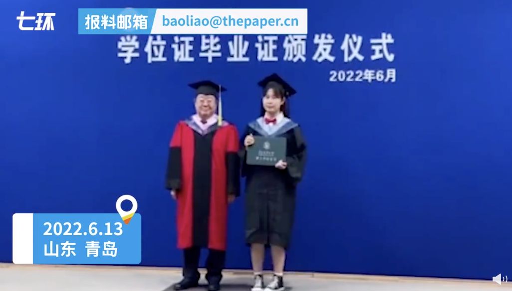 ▲青島農大校長陪畢業生合影,同姿勢站近4小時,離場時差點摔倒。(圖/翻攝澎湃視頻,下同)
