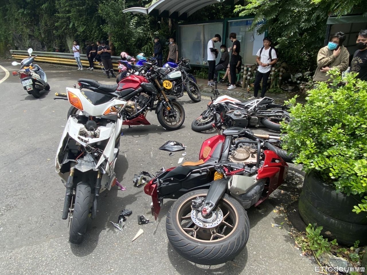 ▲騎士北宜過彎自摔,結果機車噴飛、撞爛3輛重機,現場慘不忍睹。(圖/記者陳以昇翻攝)