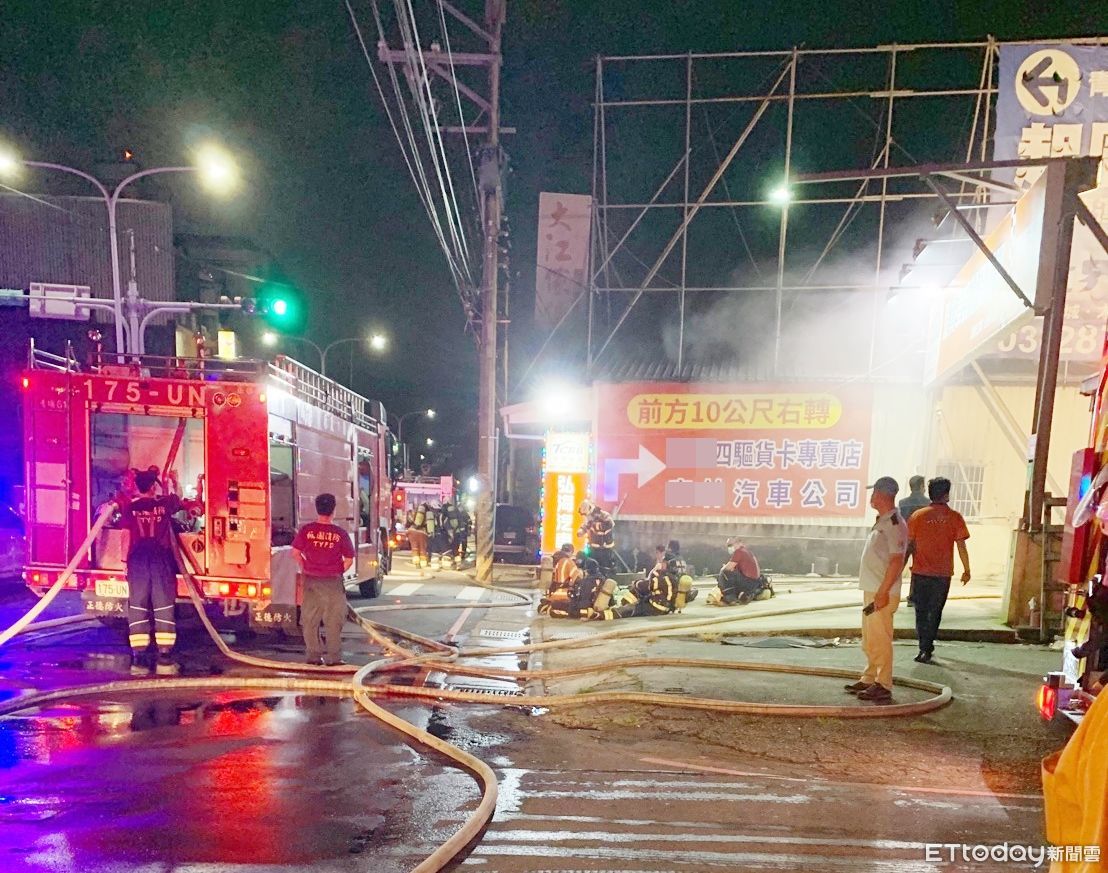 ▲桃園市中壢區中園路上一家家具行14日晚間9時許發生大火,消防人員動員多名警消灌救,現場布滿大批水線。(圖/記者沈繼昌翻攝,下同)
