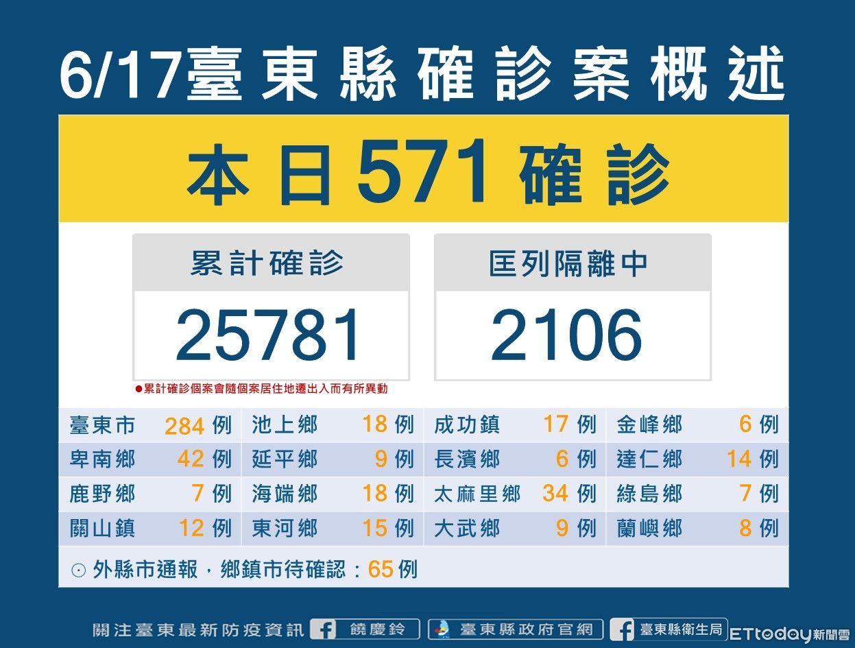 台東縣17日新增571名確診者,506名民眾戶籍或居住地分在台東、65名為外縣市醫院通報。目前台東縣累計確診個案25781人、居隔者2106人。目前台東針對Covid-19確診者分流收治情況,截至6/16下午4點為止,住院收治人數為66人、加強版集中檢疫所為47人、居家照護現管人數有4201人。