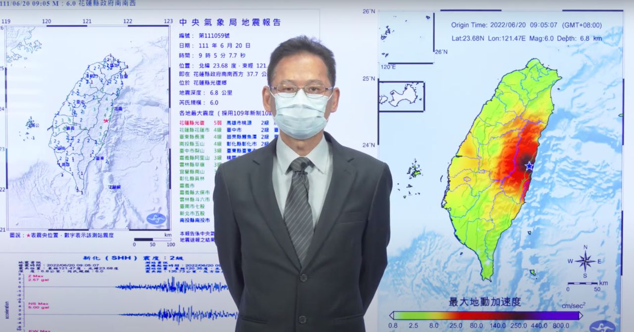 今早09:05花蓮光復發生規模6地震,中央氣象局地震中心主任陳國昌表示,估計2天內有規模5以上餘震、一週內有規模4以上餘震、一個月內有規模3以上餘震,該區「累積能量」多,釋放能量的時間會較長。另今年規模6以上地震已發生過6次,為長期平均值兩倍之多。