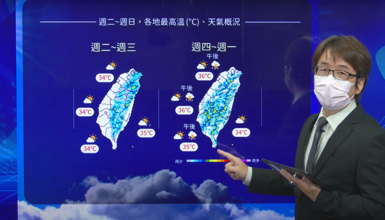 受到太平洋高壓影響,本週台灣屬於典型夏季天氣型態,白天高溫炎熱上看36度,明後兩天午後在山區、大台北、東北部降雨機率高,週四起連西半部近山區平地午後也會有雨。