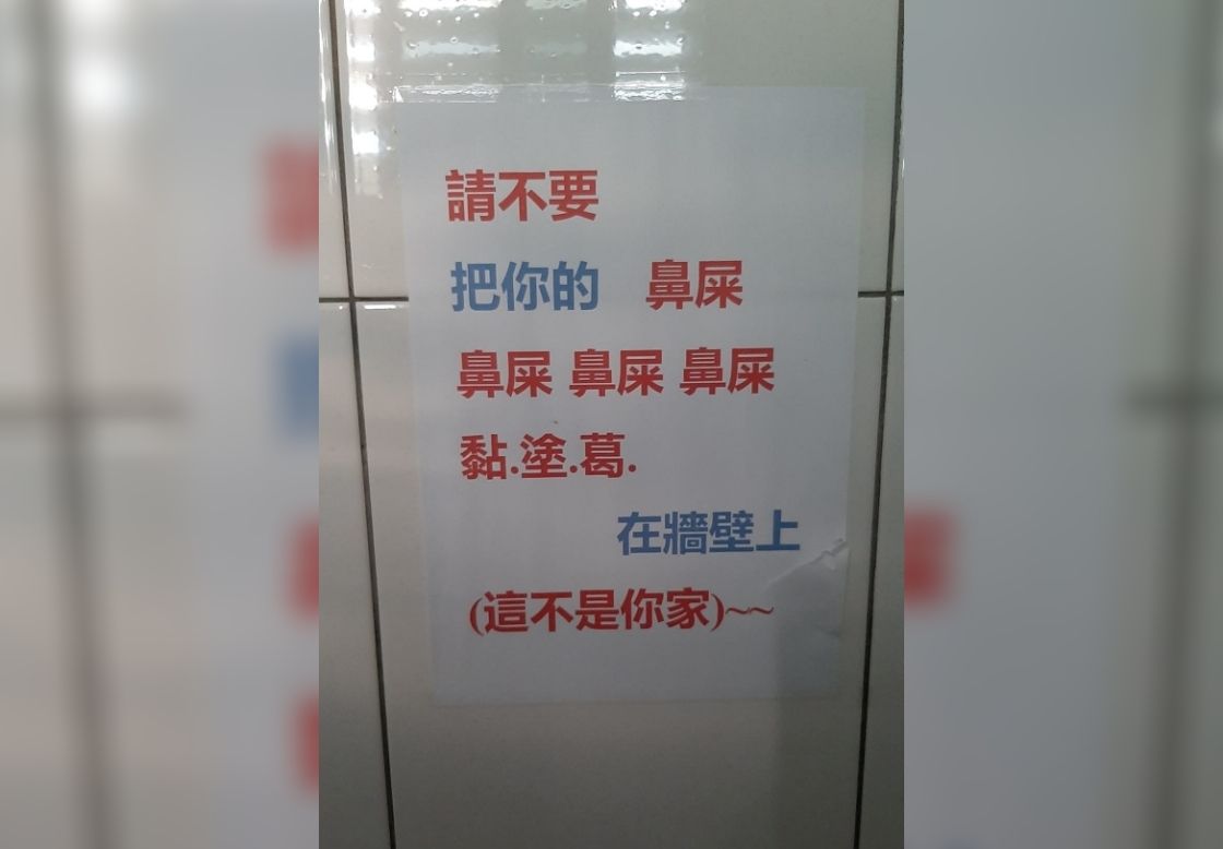 附上的照片中,只見公告上寫著,「請不要把你的鼻屎、鼻屎、鼻屎、鼻屎黏、塗、葛在牆壁上(這不是你家)」,其中鼻屎這2個字甚至使用紅色標記,並且連續強調了4次,可見負責清潔的人員心中怨念到底有多大。