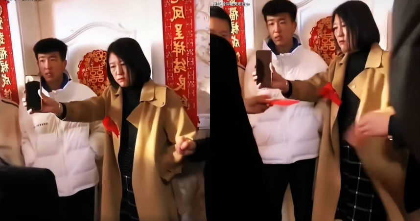 不久後,一名男方的親戚也過來勸說,一邊安慰女方姨媽的情緒,一邊讓親人趕緊掏紅包,之後立馬遞到對方眼前,通常只要笑納紅包,把門打開就可以順利落幕,不料她還是不願罷休,竟直接伸手把紅包打落在地,堅持要新郎用電子支付給錢,很顯然就是故意要激怒男方情緒,讓對方下不了台階。