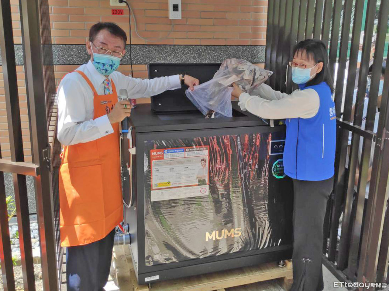 ▲因思銳國際公司捐贈運用特殊微生物分解的「廚餘處理機」予環球科大,在按圖完成機座後隆重安裝啟用。(圖/記者蔡佩旻翻攝)