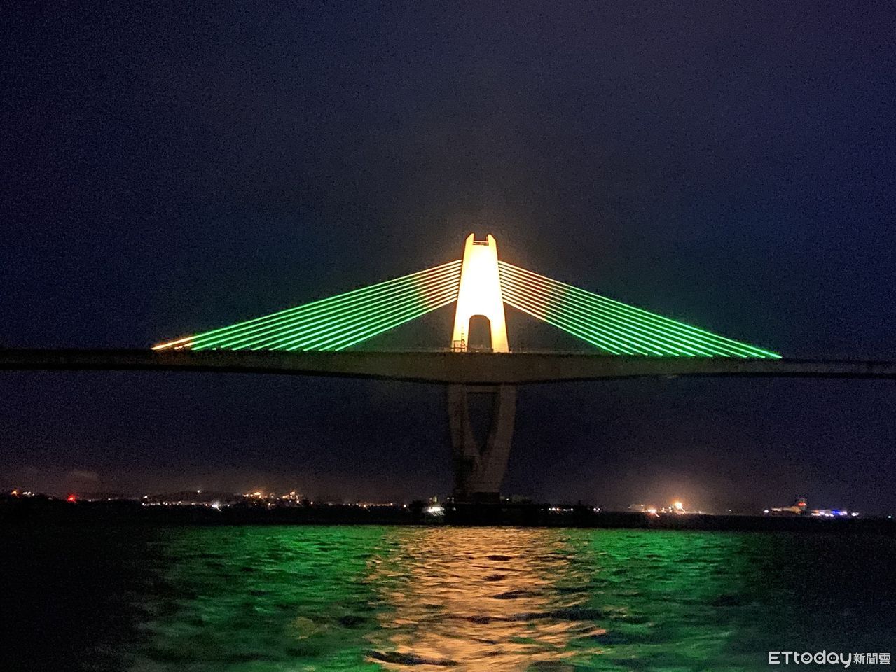 ▲金門大橋興建工程進入最後階段,施工單位21日晚間進行試燈。(圖/記者林名揚攝/下同)