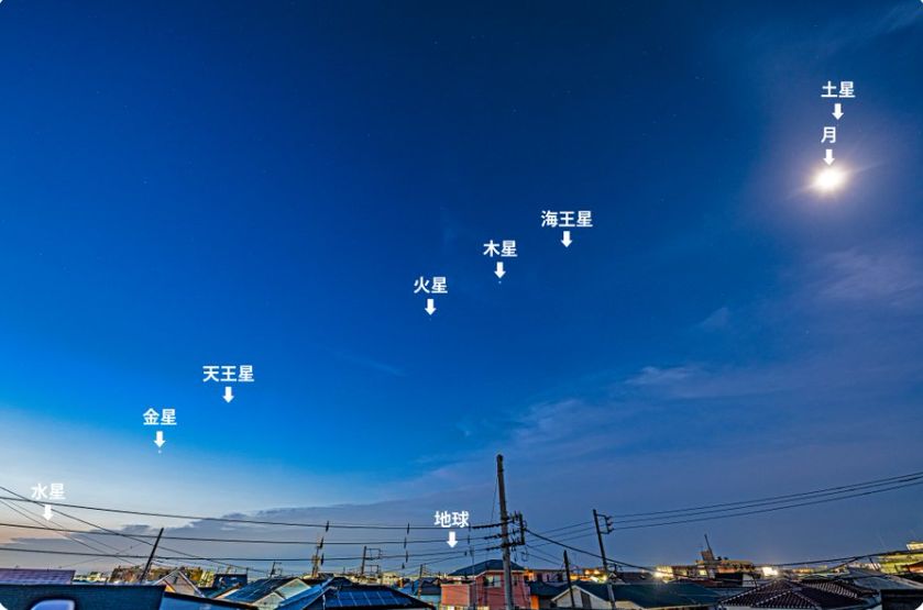 推特網友「藤井大地」是日本神奈川縣平塚市博物館的天文研究員,近日他分享一張「8星連珠」的美麗奇景,表示這是自己在19日凌晨於住家拍攝到的「惑星直列(行星連珠)」景象,畫面中由左至右依序排列著水星、金星、天王星、火星、木星、海王星、月亮、土星,藤井大地還貼心地標出了「地球」的位置。