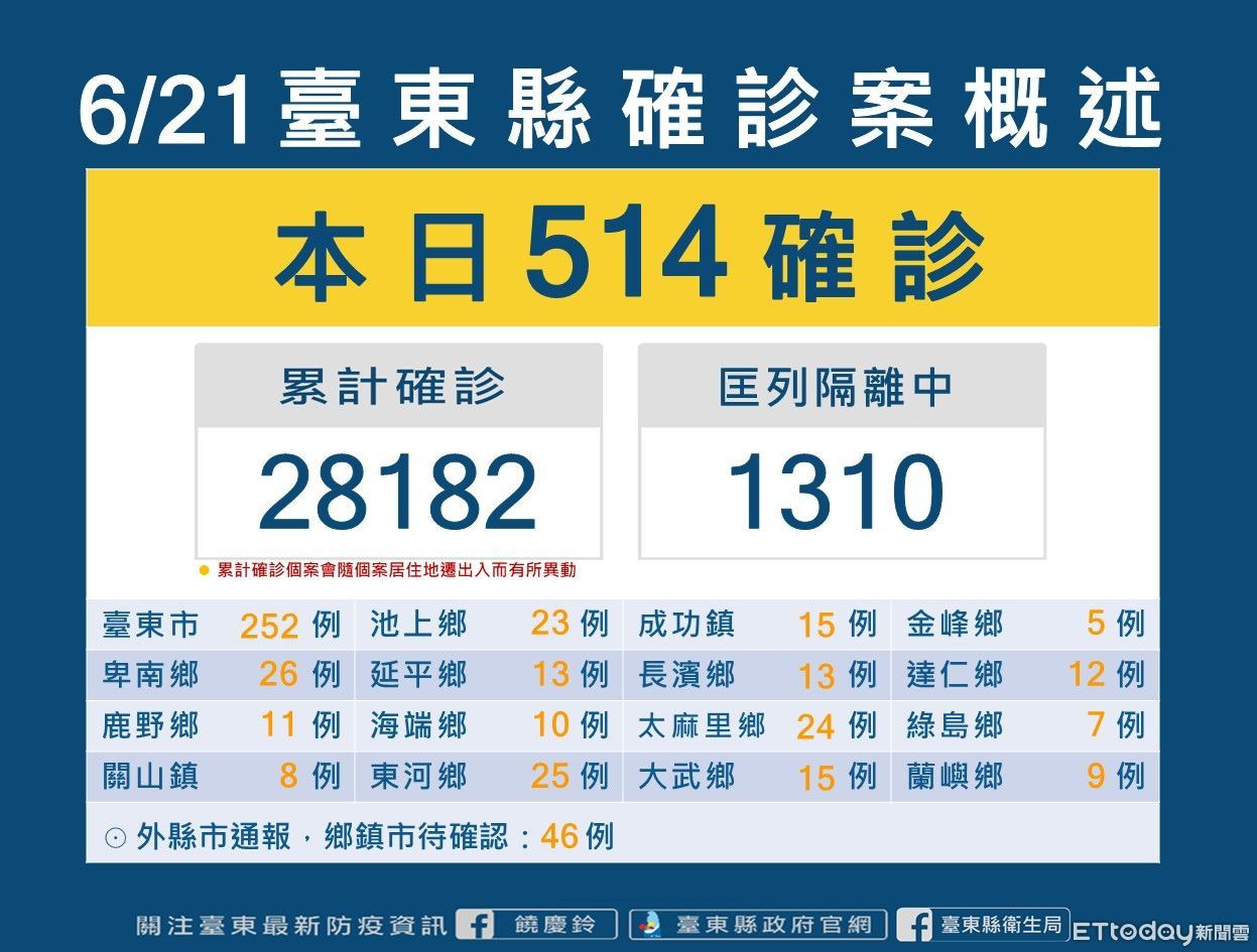 台東縣22日新增514確診者,468名民眾戶籍或居住地分在台東、46名為外縣市醫院通報。目前台東縣累計確診個案28182人、居隔者1310人。目前台東針對Covid-19確診者分流收治情況,截至6/21下午4點為止,住院收治人數為64人、加強版集中檢疫所為39人、居家照護現管人數有3021人。