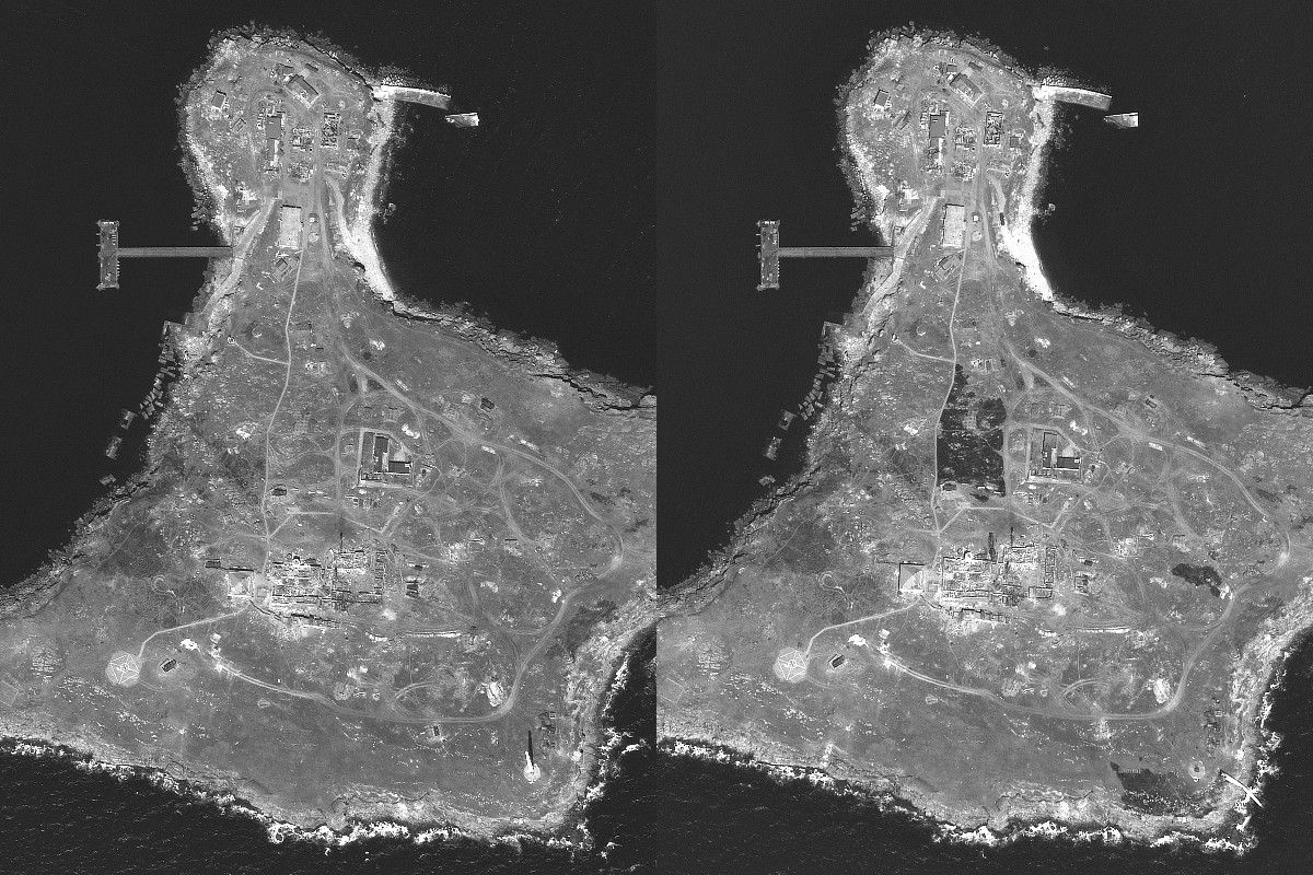 美國衛星圖像公司Maxar公佈最新衛星照片,顯示位於黑海的重要戰略地點「蛇島」(Snake Island),在俄軍與烏克蘭士兵的激烈爭奪下,如今已大面積被摧毀,變成一片焦黑,場面慘不忍睹。