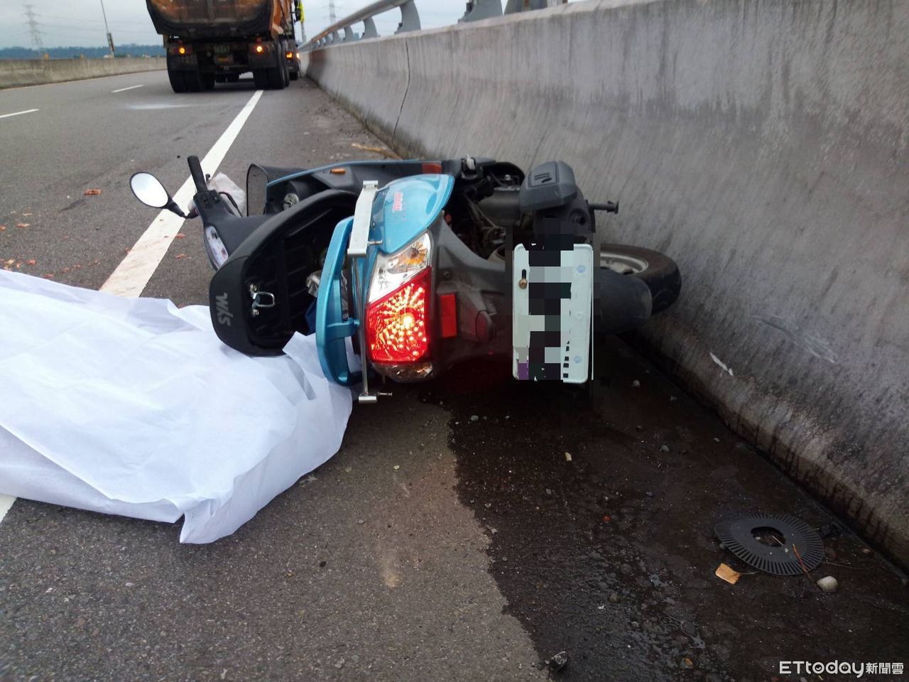 ▲苗栗縣三義鄉與台中市后里區交界的義里大橋今天下午發生1起死亡車禍。機車男騎士摔倒後滾入砂石車輪下遭輾過,頭顱破裂,當場死亡。(圖/記者蔡文淵翻攝)