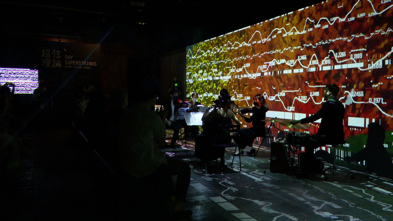 「超弦理論」則特別邀請「TPSO 台北愛樂交響樂團」以三首臺灣經典民謠「望春風」、「丟丟銅仔」、「雨夜花」重新譜曲,並採集演奏者演奏時不斷變化的腦電波數據,生成組曲專屬視覺影像,在此展區中不僅可以用耳朵聆聽澎湃激昂的美妙樂曲,更可以透過雙眼欣賞樂曲的視覺化樣貌。