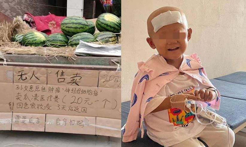 河南鄭州街頭日前出現一個「無人西瓜攤」,設下攤位的老翁因為3歲的孫女罹癌而擺攤籌醫藥費,但同時又得回老家收割麥子,所以留下了一個無人攤位,讓客人自行付錢買瓜。感人的是,許多客人看見之後自發性分享,還有人沒拿西瓜直接捐款,短短6天就成功籌得了12萬元人民幣(約53萬元新台幣)的善款。