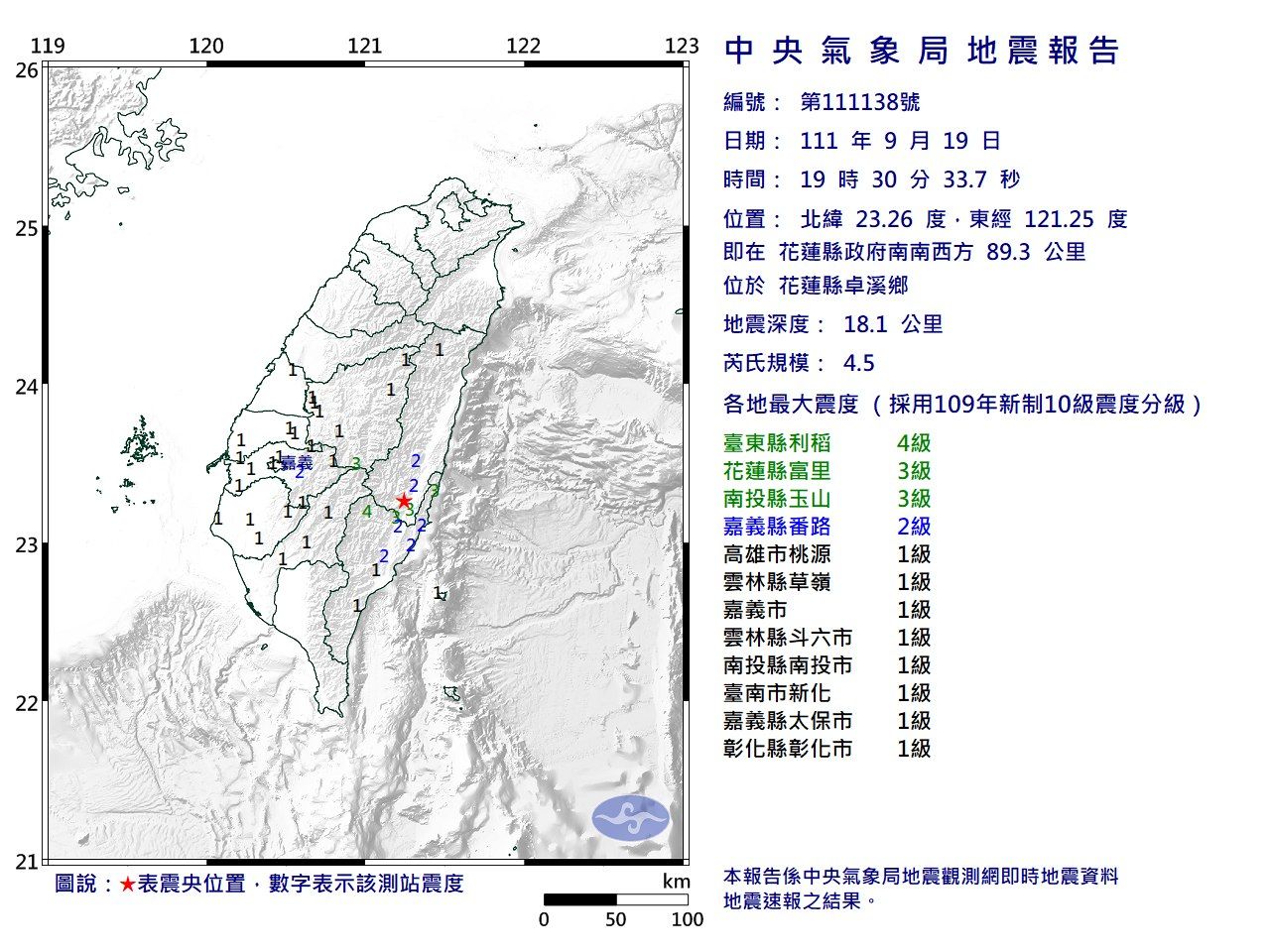 中央氣象局表示,花蓮縣卓溪鄉晚間7點30分發生規模4.5地震,震央位在花蓮縣政府南南西方89.3公里,深度18.1公里。