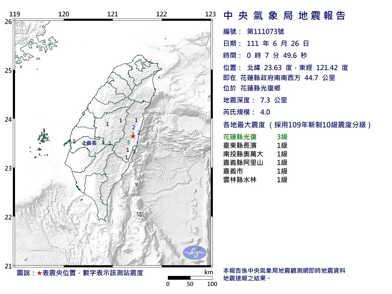 花蓮縣26日0時7分才發生規模4地震,地震深度7.3公里,最大震度花蓮3級,不料10分鐘內,凌晨0點13分、17分又發生兩次規模3.6地震,地震深度分別為5.8、9.8公里,均屬於極淺層地震。