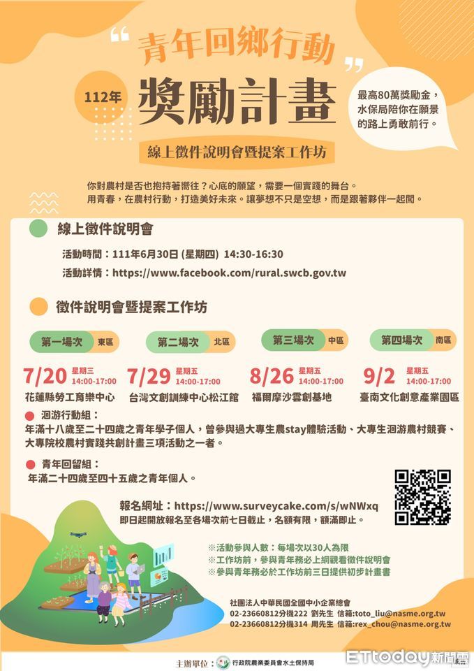 為廣邀有志青年共同參與,將於6月30日(星期四)下午2時30分於水保局臉書粉絲專頁「農村好讚」辦理線上徵件說明會,活動免報名,歡迎有興趣的熱血青年上線收看。