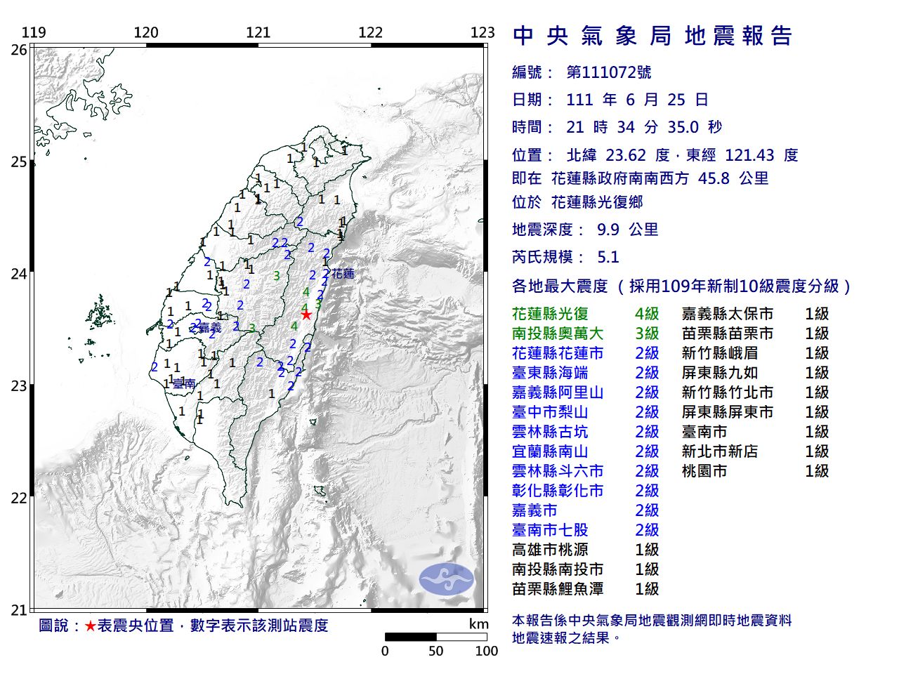 25日晚間9時34分先發生規模5.1地震,深度9.9公里,花蓮縣最大震度4級、南投縣3級,其他縣市也幾乎都有1-2級震度。