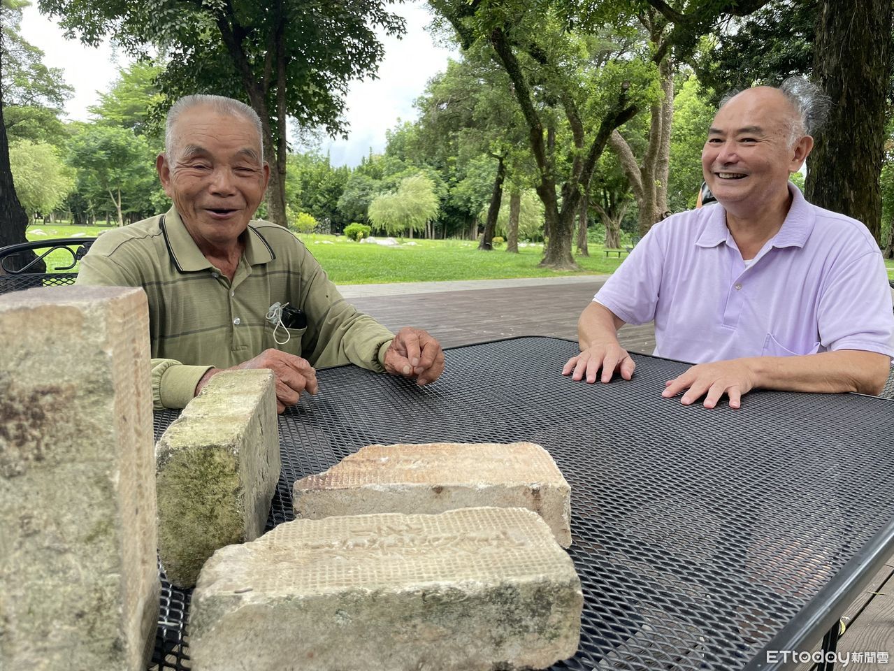 ▲迎接台南水道啟用1百年,文化局爬梳百年歷史,家住山上區的耆老吳朝全(右)帶來4塊耐火磚捐給水道博物館保存。(圖/記者林悅翻攝,下同)