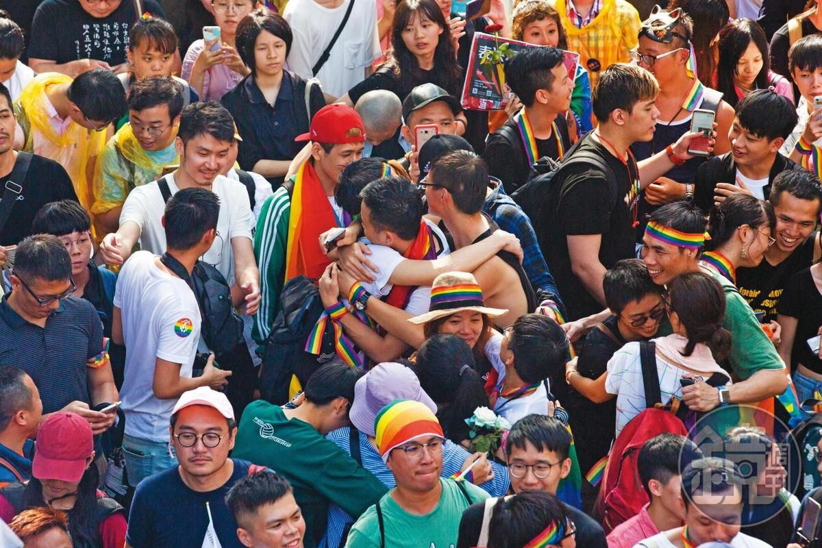 ▼同婚法於3年前通過,同志團體在立法院外相擁打氣,目前同婚已獲6成民眾支持。