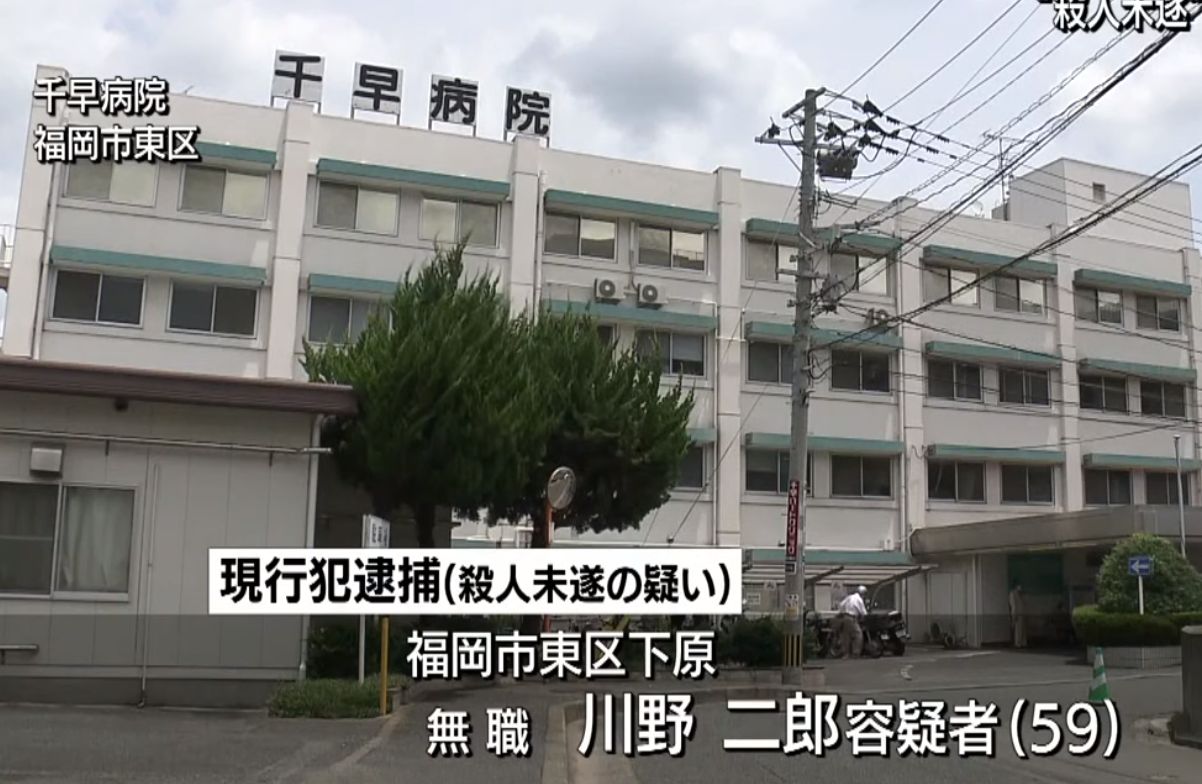 根據《日本放送協會》、《朝日新聞》報導,現年59歲的無業男子川野二郎27日上午9時50分左右,在福岡市東區的「千早醫院」中,手持摺疊小刀衝入1樓診療室,隨後便開始對著40多歲的男性醫師猛刺,企圖將其殺害。醫師當場倒地,地上則滿是血跡。