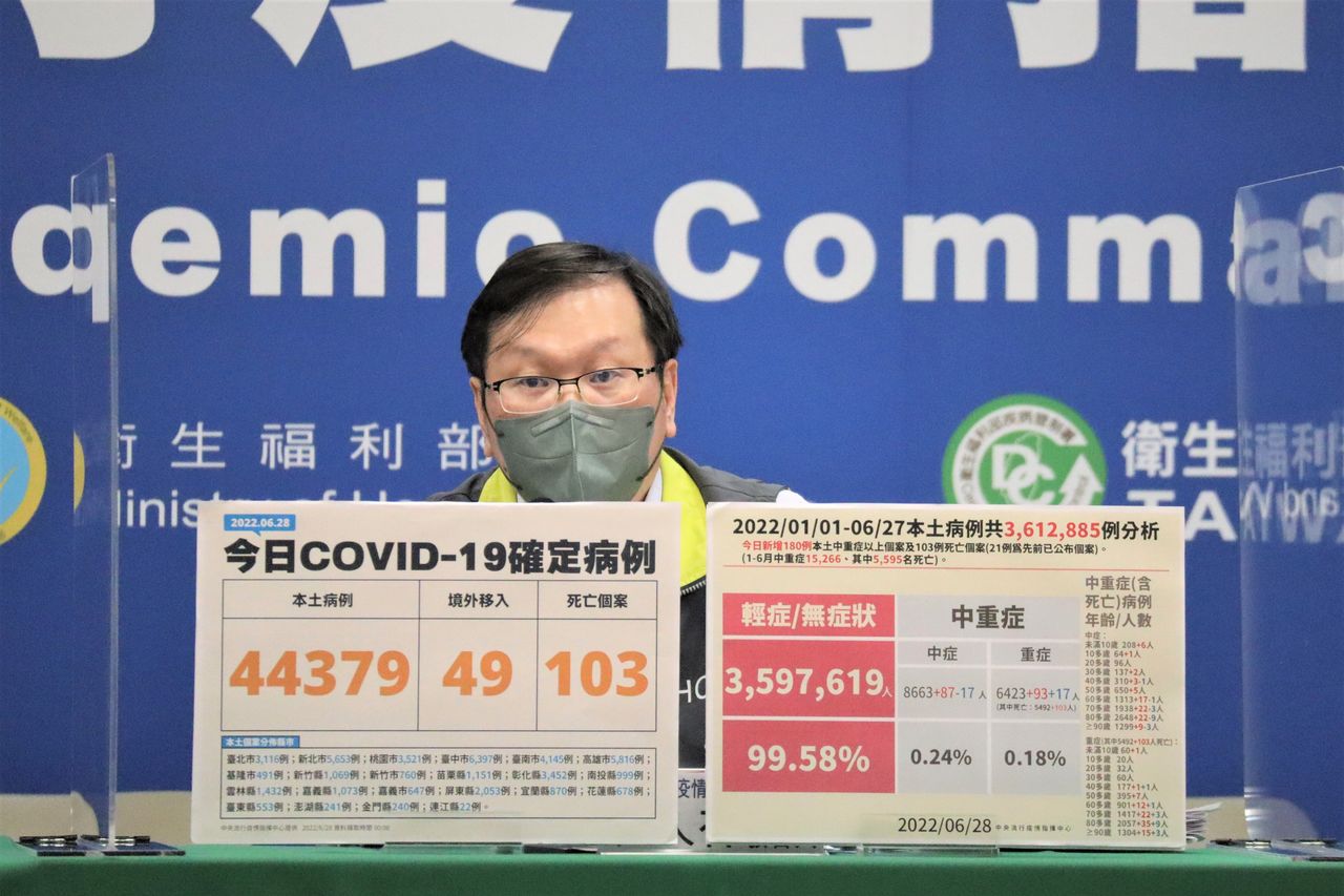 中央流行疫情指揮中心今公布國內新增44379例本土個案,另增49例境外和103例死亡,本土個案仍以台中6397最多,其次依序為高雄5816例、新北5653例、台南4145例、桃園3521例、彰化3452例、台北3116例。