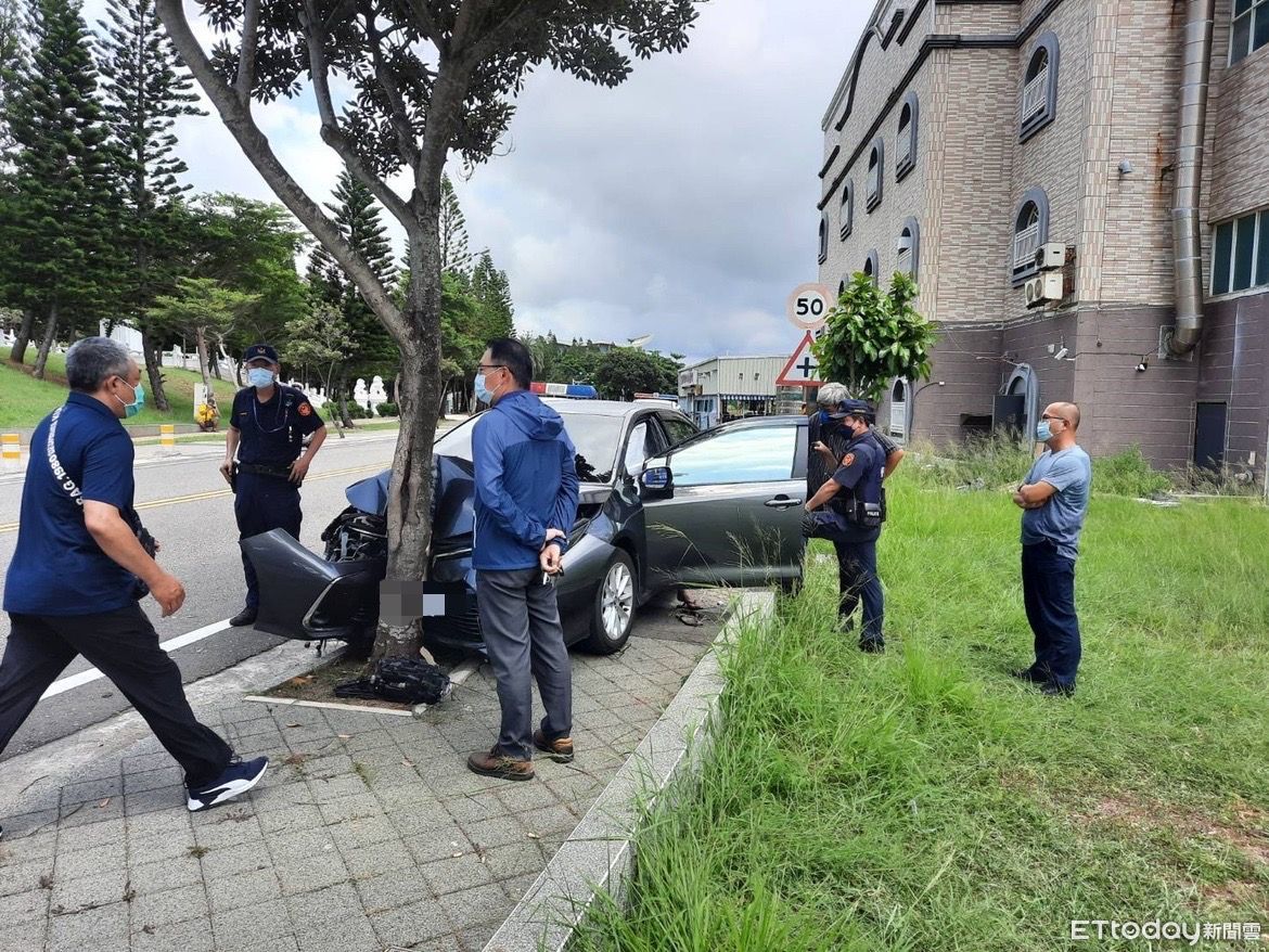 ▲黑色自小客車自撞路樹,駕駛25歲黃姓男子並無明顯傷勢。(圖/澎湖縣警察局提供)