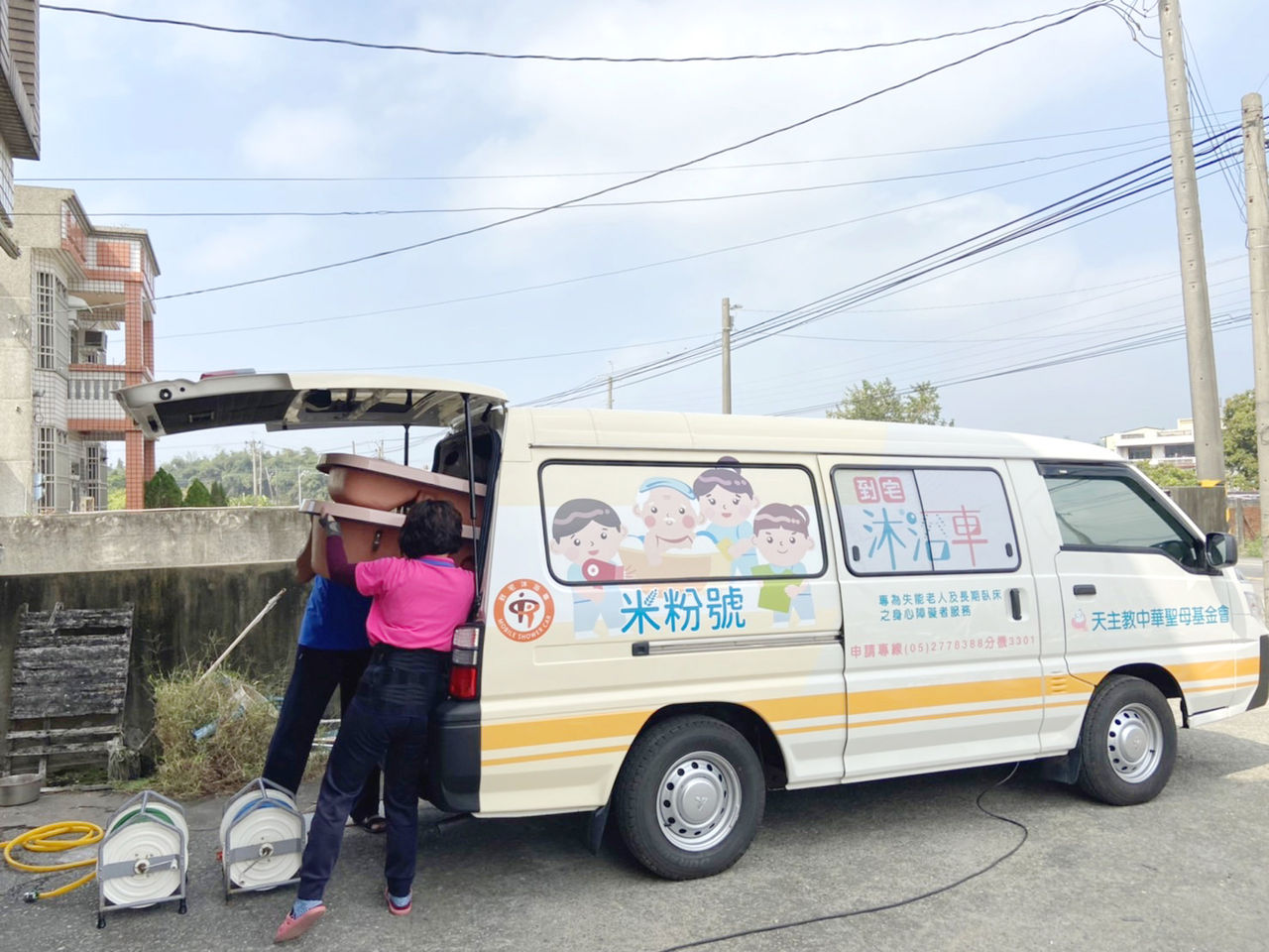 像阿嬌阿嬤一樣,沐浴對失能者與其家庭而言是那麼奢侈的渴望。天主教中華聖母基金會從2008年引進全台第一輛沐浴車與服務,開啟了台灣到宅沐浴的幸福之門,讓失能或臥床的朋友可以好好洗澡。2021年底三台沐浴車到了使用年限必須淘汰,包括知名網紅黃大米、台北台大明明補習班執行長李俊德以及福添福基金會各捐1輛沐浴車來填補車輛汰換後的長者沐浴需求。