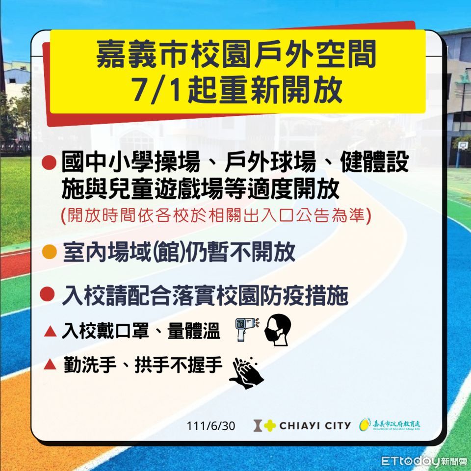 教育處處長林立生表示,因應疫情逐漸趨緩,為提供市民合適的運動空間以促進身心健康,嘉義市自7月1日起所屬國中小操場、戶外球場、健體設施與兒童遊戲場等將適度開放,開放時間由各校公告於大門或相關出入口,但室內場域(館)仍暫不開放。