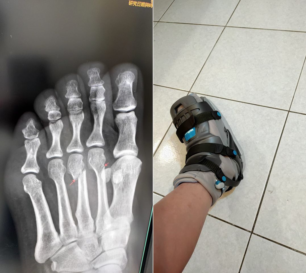 原PO隨後伸出穿戴輔助護具的左腳,並解釋自己是因踩空摔斷左腳掌第三根蹠骨,只能暫時用後腳跟走路,才會看起來走路搖搖晃晃。不料警方見狀後竟問,「啊你怎麼開車?腳受傷怎麼開?」讓她聽了愣住幾秒,思考「開車用左腳嗎?」隨後才回神並回「我用右腳開啊!」對此,警察在臨走前還不忘比個讚,並叮嚀她自己小心。
