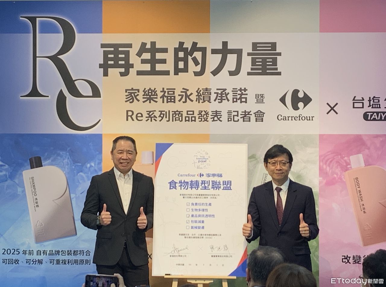 地球暖化及環境議題受到矚目,家樂福與臺鹽等單位合作,今(1)日發表首款更具永續理念的「Re系列」洗沐商品,讓消費者用平價就能體驗專櫃等級的洗沐享受,從瓶身到瓶蓋都採用環保100%再生塑料,相關說明文字也捨棄黏貼式標籤等,特別的是,瓶身完全沒有家樂福或臺鹽的LOGO,只為了「對環境更好」。