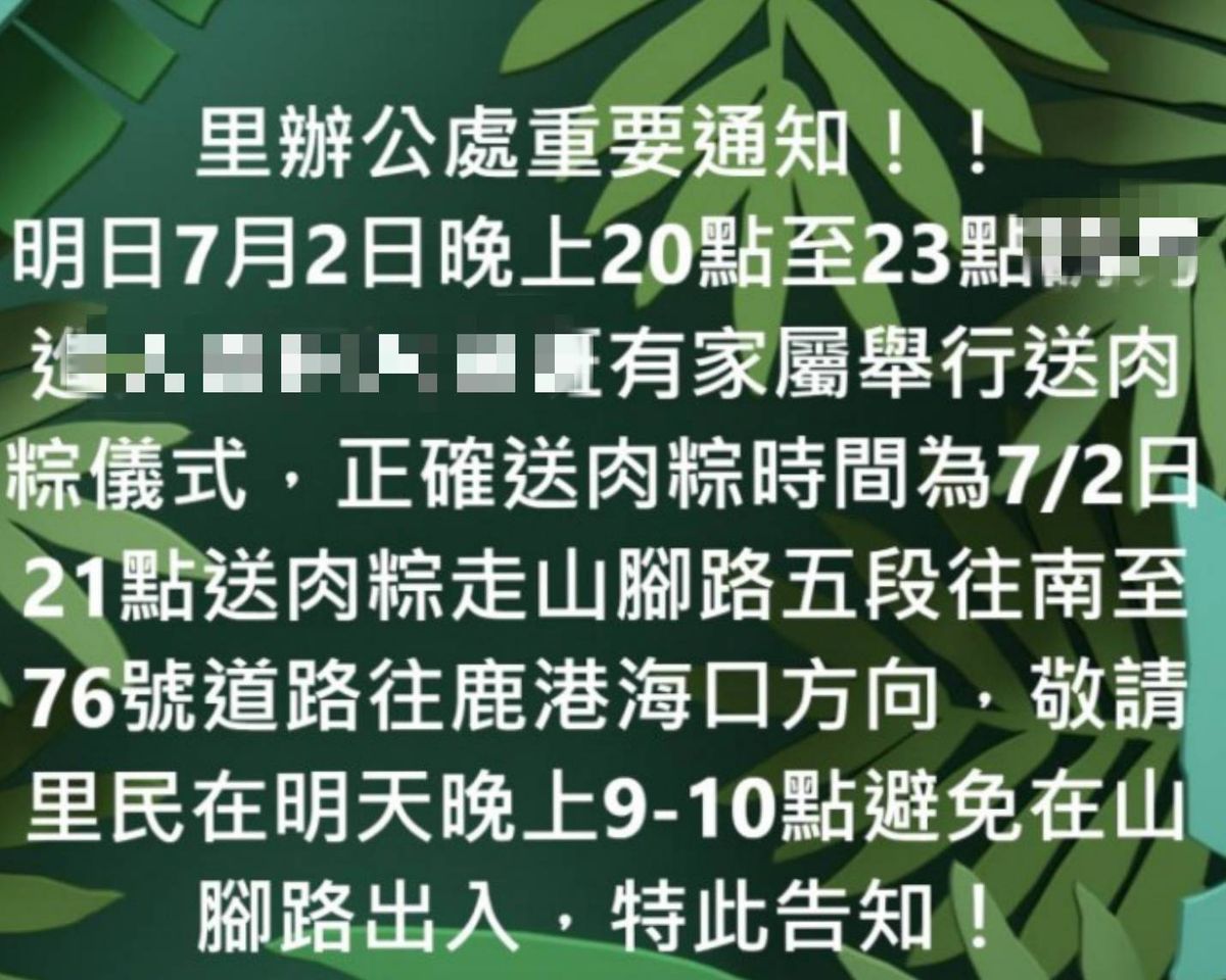 生人勿近,閒人迴避!盛行於彰化沿海一帶,主要為上吊者舉辦的「送肉粽」送煞科儀,罕見在員林市舉辦,臉書「大村人」po出里辦公處重要通知,明(2)日20點至23點有家屬舉行送肉粽儀式,路線將走山腳路五段往南至76號道路往鹿港海口方向,敬請里民在明天晚上9-10點避免在山腳路出入。