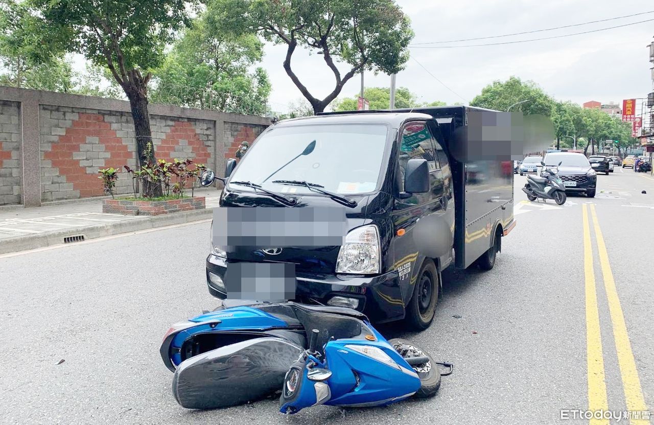 ▲桃園市八德區2日上午8時許,年約60歲蘇姓男子騎車行經和平路附近突然左轉,導致同向保全運鈔車煞車不及撞飛。(圖/記者沈繼昌翻攝)