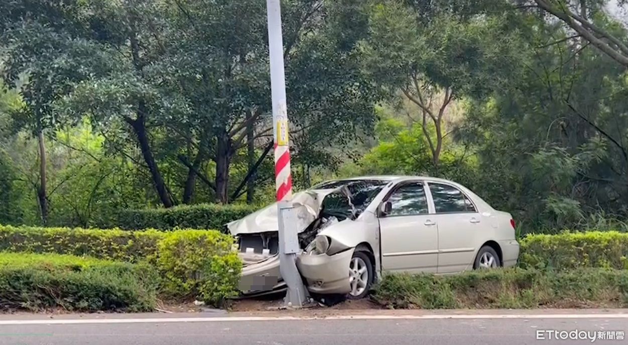 ▲昨(2)日下午15時左右,一名張姓女子載2位小朋友行經經金湖鎮黃海路南雄圓環,疑似疲勞駕駛自撞電線桿。(圖/記者林名揚翻攝,下同)