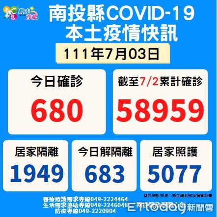 中央流行疫情指揮中心今天公布南投縣確診人數680例,截至7月2日累計確診人數5萬8959例,居家隔離人數1949例,今日解除隔離人數683例,居家照護人數5077例,各鄉鎮確診人數即時訊息詳見https://reurl.cc/2ZWkKO;新增死亡2人:90至99歲1人、80至89歲1人,均有罹患慢性病病史,未接種疫苗1人、接種3劑1人,累計死亡人數計174人。