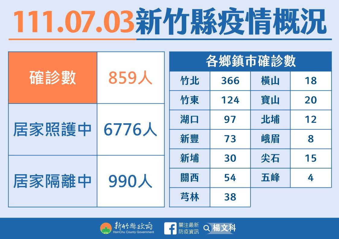 新竹縣今日新增859例本土確診案例,居家隔離990人、居家照護列管人數6776人,今年累計確診人數9萬6716人。為提升接種量能,7月4日至8日衛生局安排5鄉鎮市衛生所擴大社區接種,除了持通知單長者外,並提供隨到隨打服務。另由仁慈醫院開設1場500名額的預約場次,希望擴大服務更多鄉親,讓民眾接種更方便。