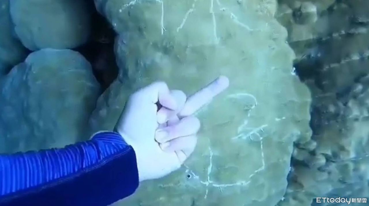 ▲珊瑚礁被刻你好,潛水教練比中指譴責。(圖/記者楊漢聲翻攝)