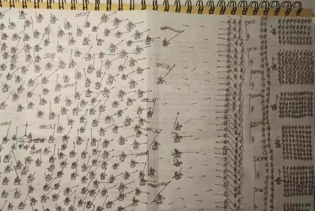 一名爸爸在臉書社團「爆廢公社公開版」分享家中出了一位「小畫家」的趣事,他表示,因為近日與妻子兩人,發現兒子的成績有退步的情況,孩子的媽為了找出退步的原因,只好去檢查兒子的作業簿,結果在書包內發現一張鉛筆繪出的「千軍萬馬圖」。